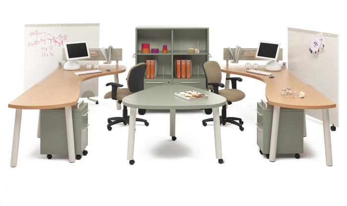 The need to interact, share information and knowledge is critical to facilitating employee productivity. This arrangement supports the team environment, with uninterrupted worksurface spans, abundant storage and nearby file storage. DesignForm worksurfaces allow fluid transitions between curvilinear and rectilinear forms. The DesignForm sweeping top shapes and radius edges are enhancements to our hardworking and durable Elements product line.