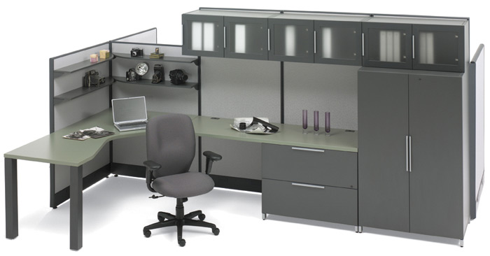 Concept 2001 takes modularity all the way. Flexible, compact, elegant and light. That's how your office shapes up with Concept 2001. Concept 2001 energizes your routine with a corner layout that contrasts our Dark Chocolate and Willow Grey with Silver accents. Thick 1-inch edges on work surfaces provide a quality finished look. The feeling is light and spacious and the functionality is complete.