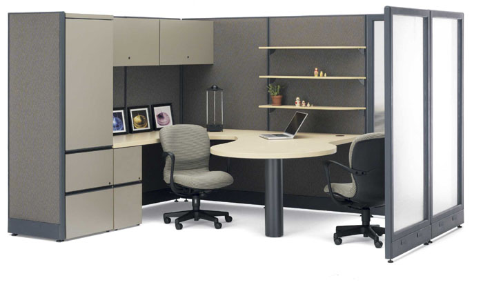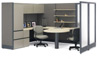 In the form-follows-function mode, many managers in downsized organizations find themselves wearing more hats and personally handling more phases of projects than before. The need arises, then, to provide space for all the reference materials needed, as well as an in-office meeting area and an area for concentrated task work. A U-unit equipped with a bowfront desk and a stackable overshelf system meets these requirements in a compact footprint.
